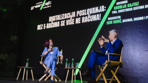 Novosti "Bez e-Računa se više ne računa": Andreja Kajtaz na Greencajt festivalu o nadolazećim promjenama od 1.1.2026. Na petom Greencajt festivalu, Finina direktorica Andreja Kajtaz u razgovoru s Igorom Bobićem odgovorila je na ključna pitanja o digitalizaciji poslovanja i obveznoj razmjeni e-računa među poduzetnicima 22. 5. 2025.