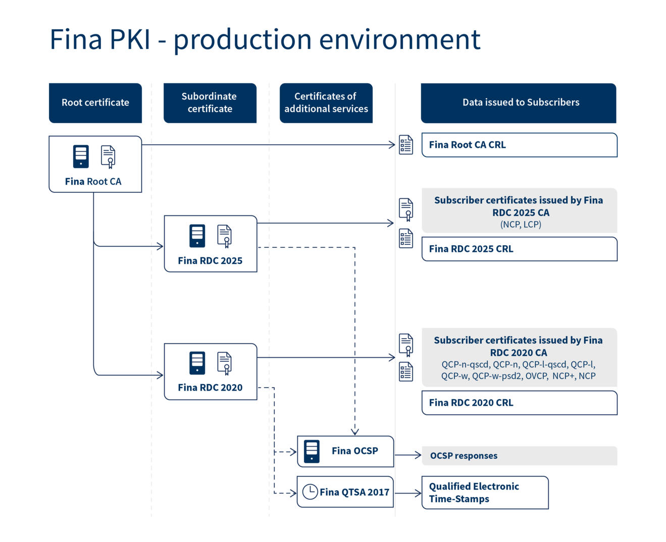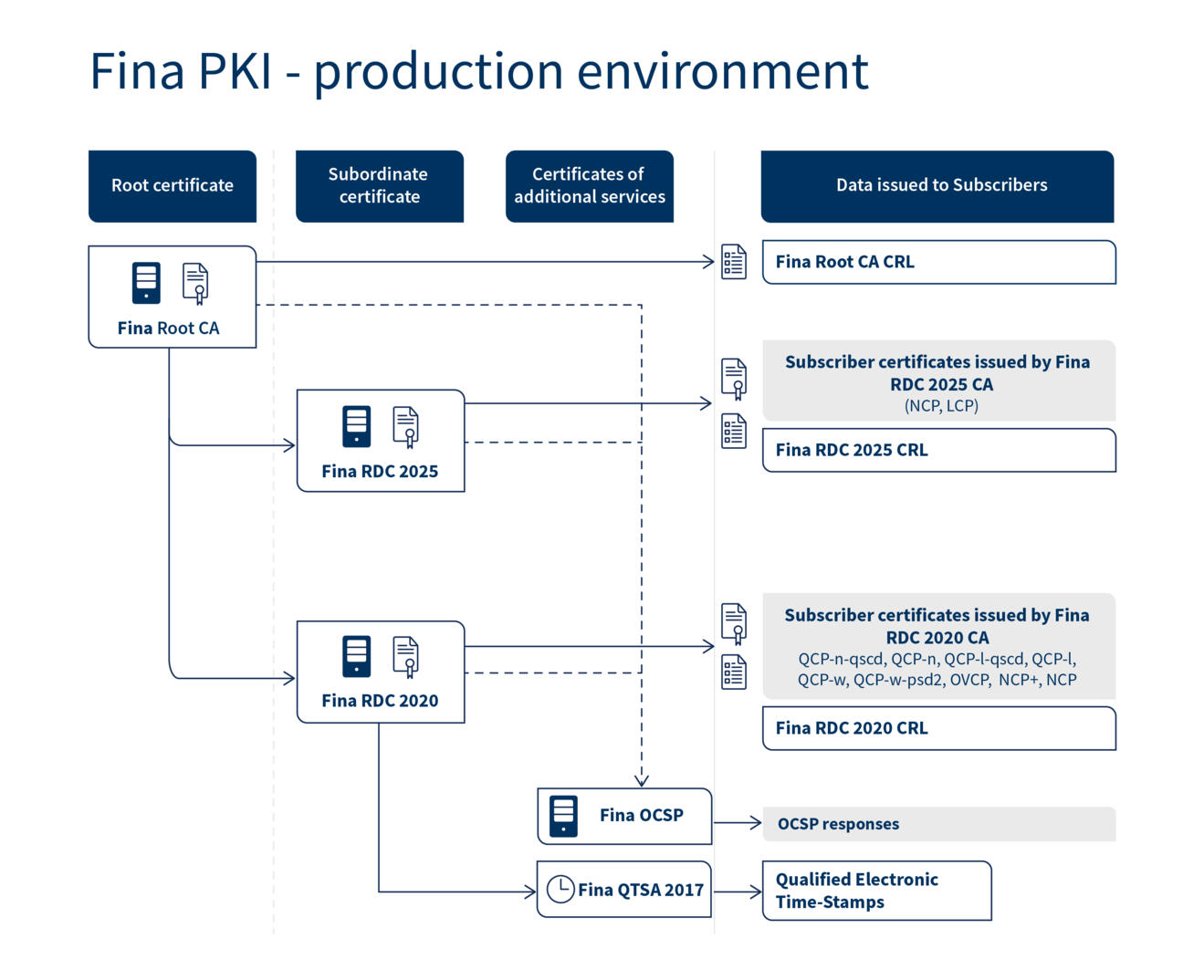 For the purpose of providing Certification services in Croatia, Fina has established through its Register of Digital Certificates a Public Key Infrastructure (PKI) including the following Certification Authorities (CA):